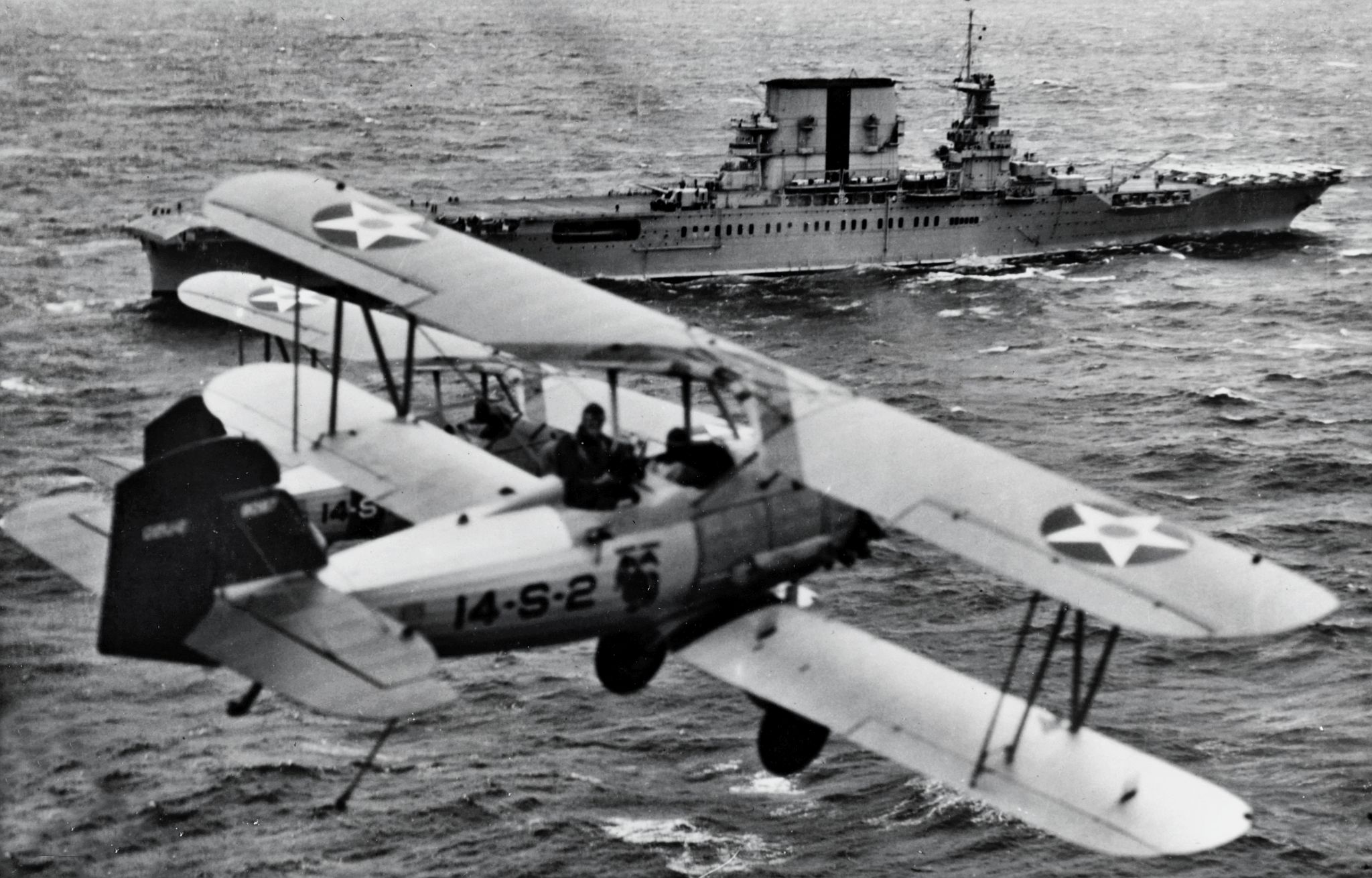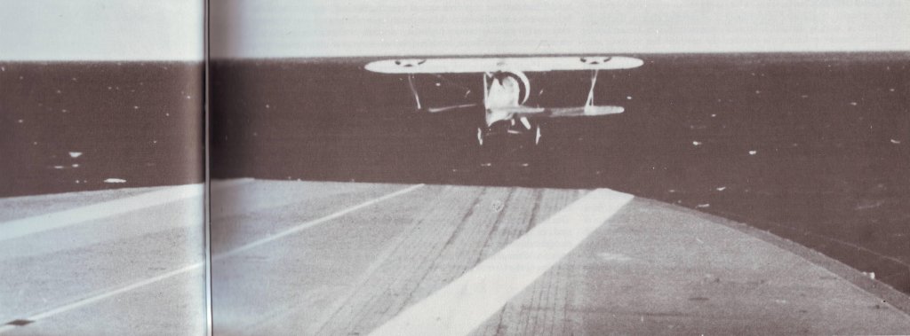 151k | A Chance Vought UO-1 piloted by LCDR Marc Mitscher makes the first landing aboard the aircraft carrier USS Saratoga (CV-3). The fore-and-aft arresting wires were engaged by a "comb" between the aircraft's wheels. The "fiddle bridges" held the wires off the flight deck. Athwartship wires which were snagged by an arresting hook on the aircraft were in simultaneous use. The fore-and-aft wires were soon abandoned. U.S.Navy photo. |