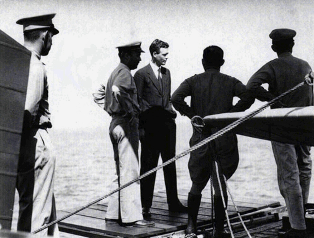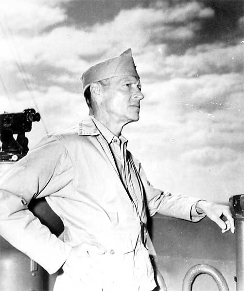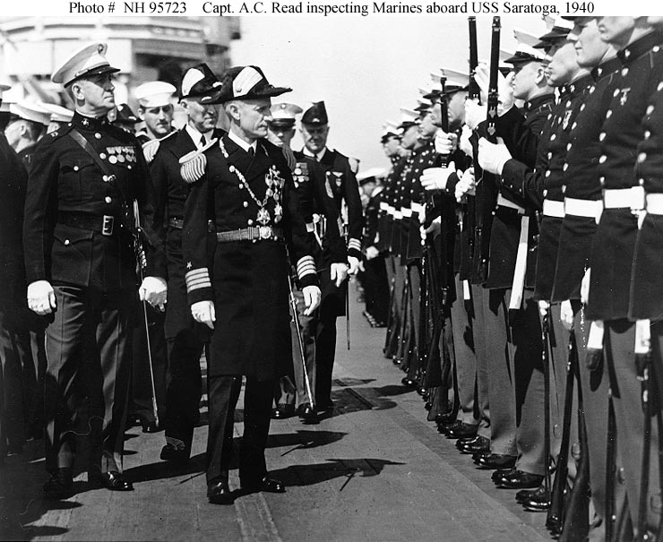105k | Captain Albert C. Read, USN, Commanding Officer, USS Saratoga (CV-3) inspects the ship's Marines during change of command ceremonies, 15 March 1940. Captain Robert P. Molten, USN, the new CO, is visible over Read's right shoulder, also wearing a "fore and aft" hat. Collection of Vice Admiral Dixwell Ketcham, USN. U.S. Naval Historical Center Photograph (# NH 95723). |