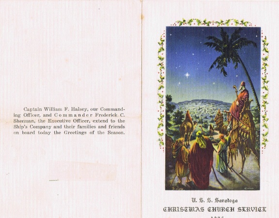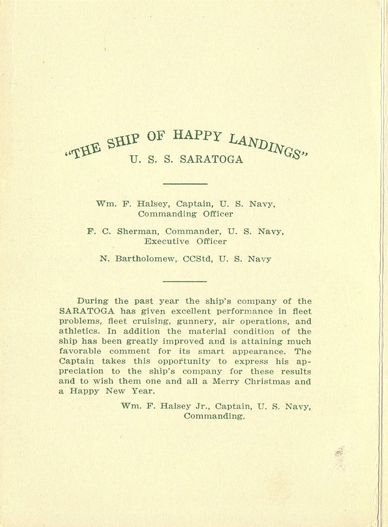 246k | USS Saratoga, "The Ship of Happy Landings," Christmas Menu, 1936. Long Beach, California. Commanding Officer was Captain William F. Halsey, Jr. Later, he was Commander, Third Fleet in the advance across the Pacific during World War II, and attained the rank of Fleet Admiral (the fourth and last officer to hold that rank). Executive Officer was Commander Frederick C. Sherman. A renowned leader of carrier task groups during World War II, he was awarded three Navy Crosses and attained the rank of Vice Admiral. |