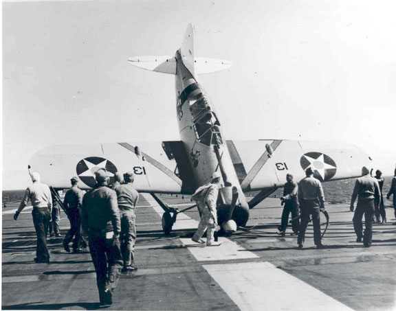 65k | Brewster F2A-1 Buffalo, Bureau Number 1393, after LT John Smith "Jimmy" Thach tipped the aircraft onto its nose on the Saratoga's deck, 11 March 1940. Ensign Edward Butch O'Hare also flew this aircraft several times during the summer and fall of 1940. Photo source unknown. |