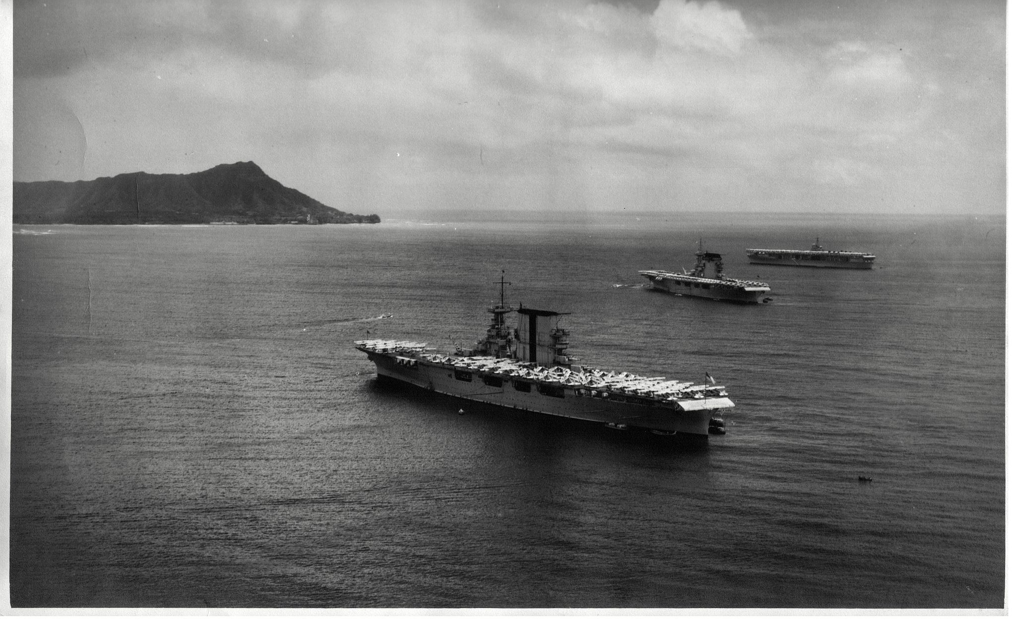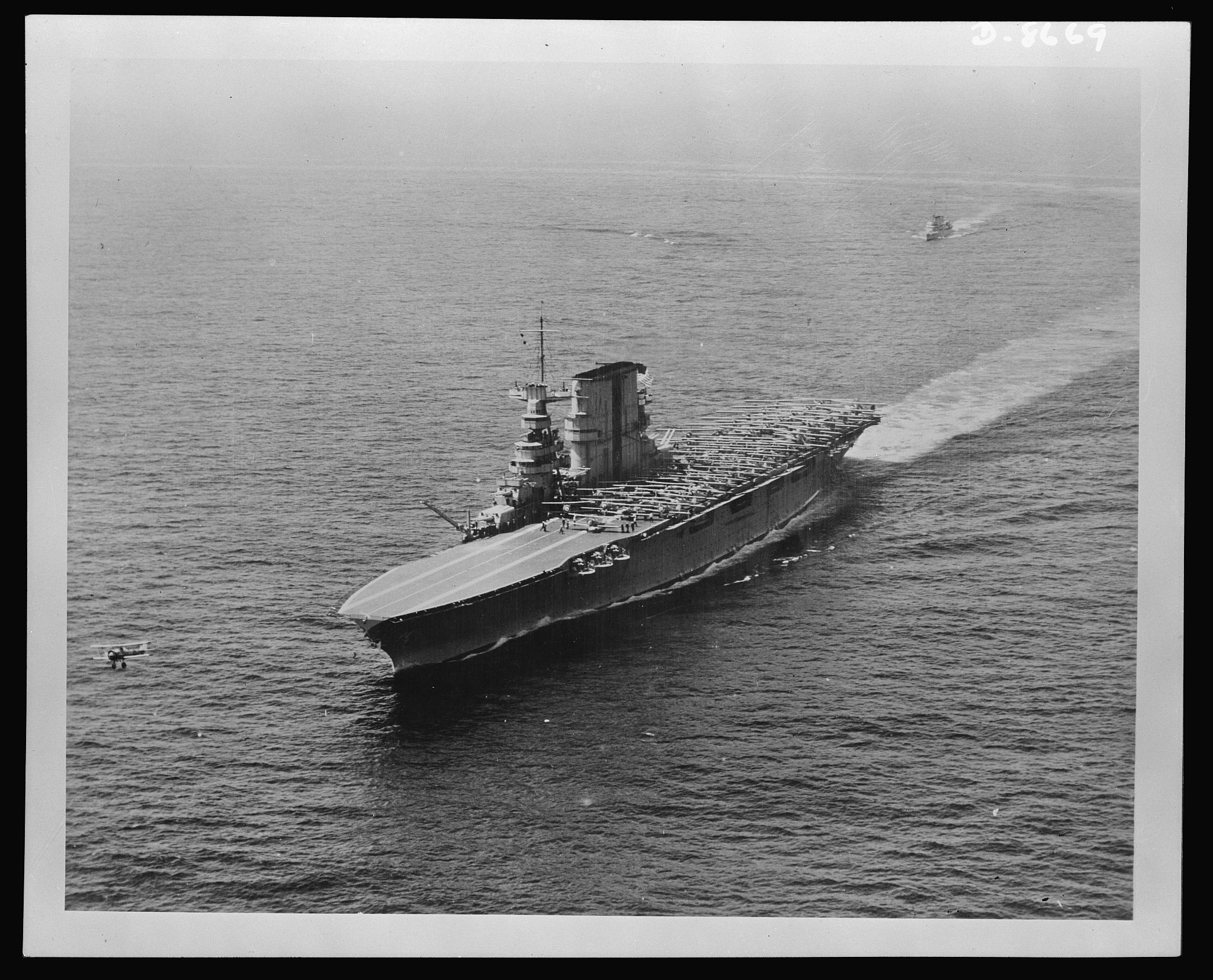 489k | USS Saratoga (CV-3) at sea, circa 1927‐1929. Destroyer USS Tracy (DD-214) is visible in the background. Courtesy of the Naval Historical Foundation, Admiral William V. Pratt Collection. U.S. Navy photo from the U.S. Naval History and Heritage Command, # NH 75885. |