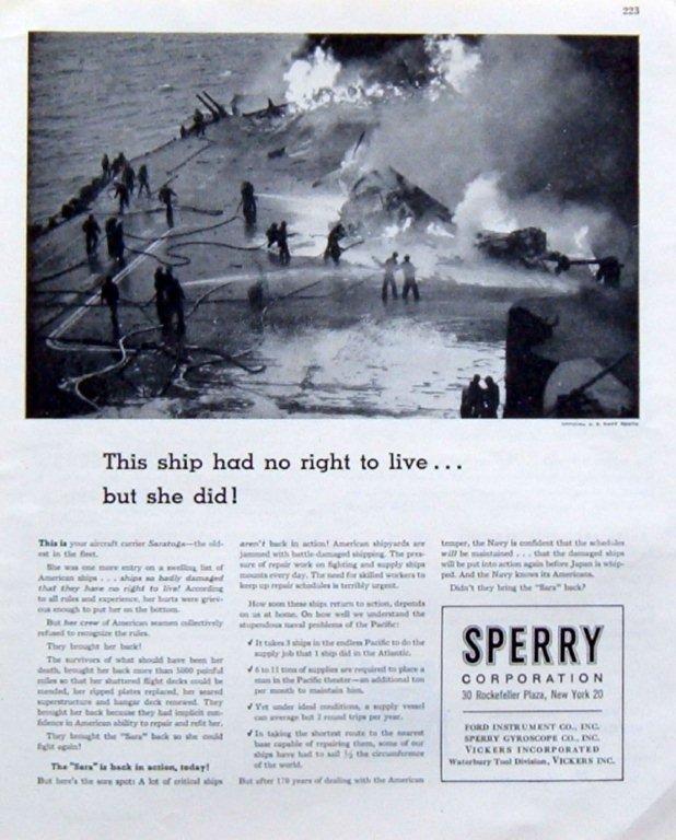 79k | 1945 Vintage Ad: Sperry Corp. Gyroscope, US Navy WWII Aircraft Carrier Saratoga. |