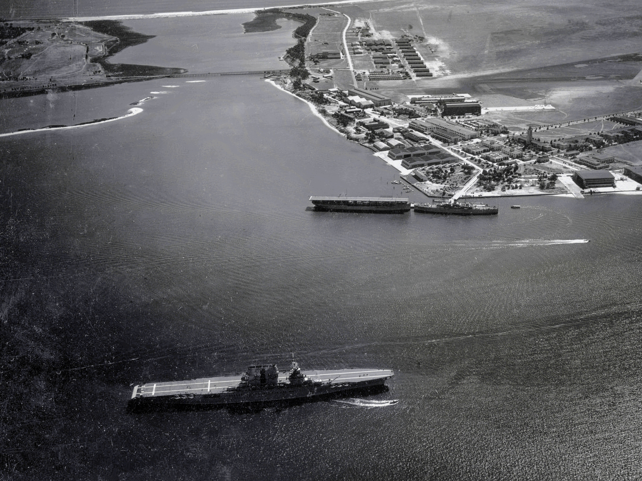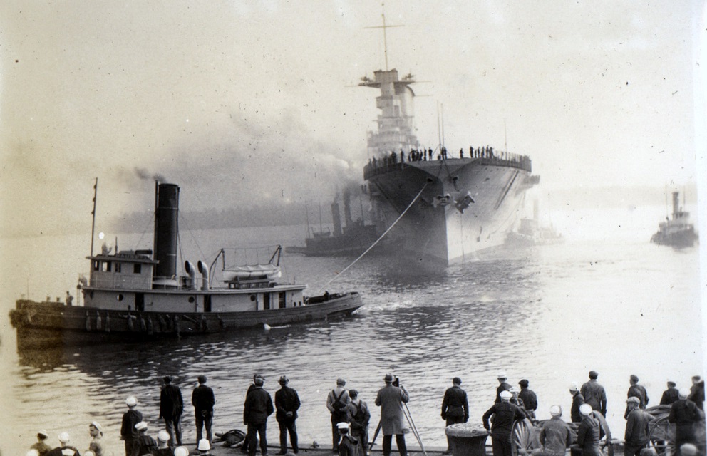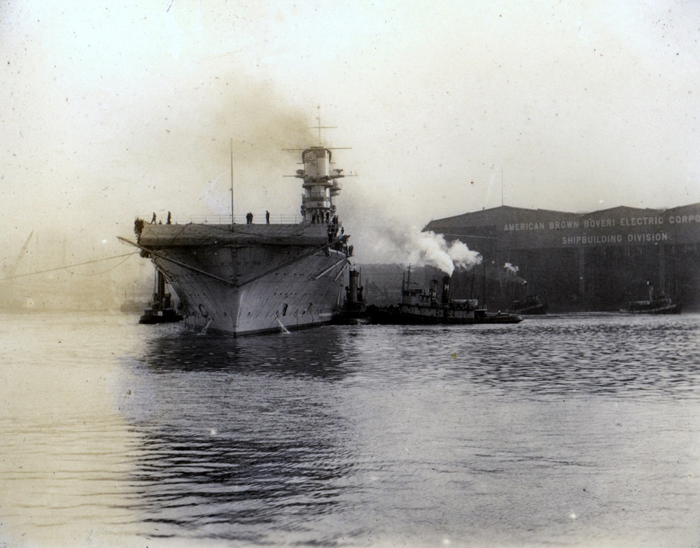 318k | Tugs ease Saratoga (CV-3) down the Delaware River to the Navy drydock. National Naval Aviation Museum, photo # 1996.488.011.007. |