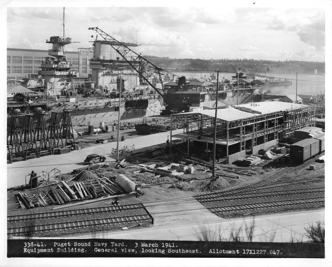 358k | "THE END OF THE BLACK STRIPE—A rare and fascinating view of USS Saratoga (CV-3) in the newly built Dry Dock #4 at Puget Sound Naval Shipyard on March 3, 1941." "You can see the yard workers in the process of painting out the famous black stripe that had been there since 1929 to distinguish her from her near identical sister, USS Lexington (CV-2)." "From 6 January to 28 April 1941, Saratoga underwent a long-deferred modernization at the Bremerton Navy Yard that included the widening of her flight deck at her bow and the installation of additional antiaircraft guns and a CXAM-1 radar." ("338-41. Puget Sound Navy Yard. 3 March 1941. Equipment building. General view, looking Southeast. Allotment 17X1227 047") |