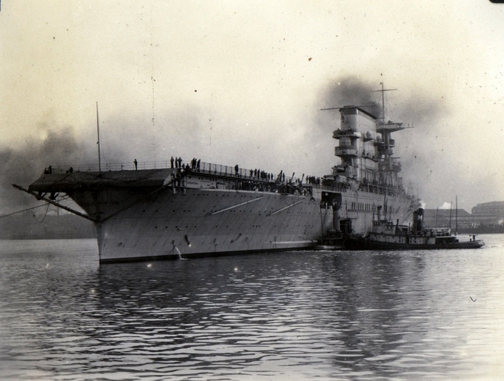 212k | USS Saratoga (CV-3) being assisted by tugs off Philadelphia Navy Yard circa late 1927–early 1928, shortly after being commissioned. National Naval Aviation Museum photo . |