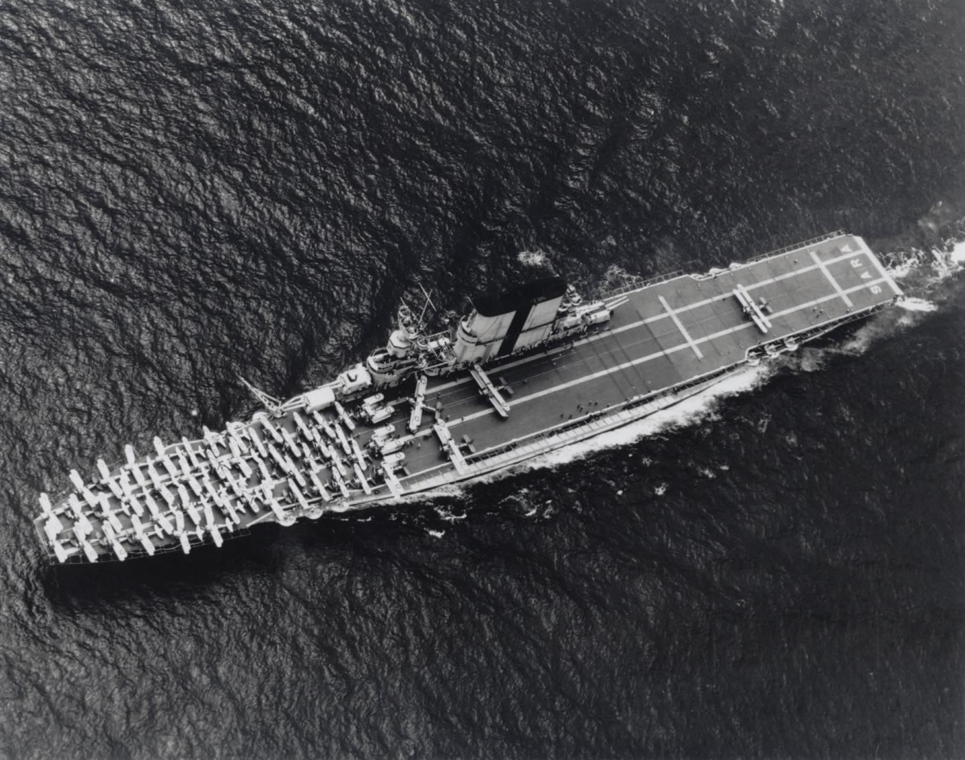 | Aviation facilities: | 2 elevators (fwd, 29' 4¾" x 59' 4¾" [9.0 x 18.1 m], 16,000 pounds [7,257.5 kg]; aft, 29' 2¾" x 34' 10¾" [8.9 x 10.6 m], 6,000 pounds [2,721.6 kg]); 1 flywheel catapult flight deck: 866' 2" x 105' 11¼" [264 x 35.4 meters] |