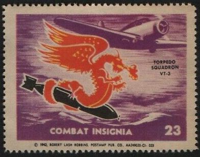 28k | Torpedo Squadron (VT) 3 was established as Torpedo & Bombing Squadron VT-2 on 6 July 1925, redesignated VT-2B (B for Battle Force) on 1 July 1927, and finally VT-3 (Torpedo Squadron THREE) on 1 July 1937. This stamp was published by the Hearst Publishing Company in 1942. Insignia shows a fire-breathing flying dragon astride a torpedo. "The Flying Dragons" operated from USS Saratoga (CV-3) until May 1942, and again from August 1942 until September 1943. Redesignated VA-4A in 1946 and VA-35 in 1948, the squadron was finally disestablished on 7 November 1949. |