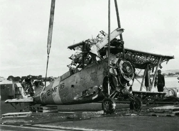 105k | A former U.S. Marine Corps Grumman F3F-2 (# 0976) at the U.S. Naval Aviation Depot North Island, California, after its salvage in 1990. This F3F-2 was assigned to the U.S. Marine Corps at Quantico, Virginia, on 21 December 1937. The aircraft served briefly with Marine Fighter Squadron (VMF) 1, but was assigned to VMF-2 at Naval Air Station (NAS) San Diego, California, on 17 January 1938. On 29 August 1940 the plane was piloted by First Lieutenant (later Brigadier General) Robert E. Galer for carrier qualification aboard USS Saratoga (CV-3) off the coast of California. On approach for one landing, Galer shifted to his reserve fuel tank, but the engine quit and left Galer with no choice but to ditch the aircraft. It sank to a depth of 600 m and was discovered in 1989. It could be salvaged by USNS Narragansett (T-ATF 167) on 5 April 1990, was restored at the San Diego Aerospace Museum for three years and is currently on display at the National Naval Aviation Museum at Pensacola, Florida. |