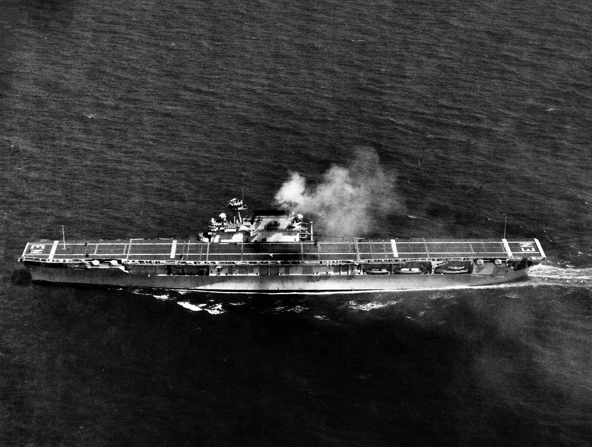 139k | Aerial view of USS Enterprise (CV-6) at sea in January 1940. During this period, "EN" was painted on the forward and rear areas of the flight deck, to facilitate identification of the ship from the air. Item part of a scrapbook assembled by CDR William H. Balden, USNR, documenting his World War II service. National Naval Aviation Museum, photo #2007.084.001.510. |