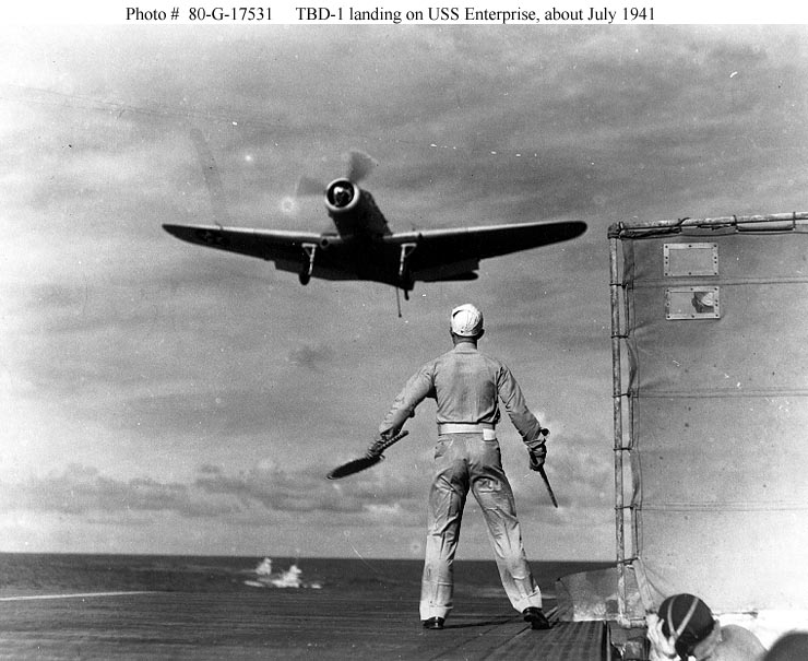 86k | Douglas TBD-1 Devastator torpedo plane landing on board USS Enterprise (CV-6), in about July 1941. Note landing signal officer is in the foreground, and plane guard destroyers in the center distance. The original photo caption gives a date of 8 April 1942, which is highly improbable as the plane is in mid-1941 vintage overall gray paint and the destroyers are wearing peacetime light gray paint. Official U.S. Navy Photograph, now in the collections of the National Archives (photo # 80-G-17531). |