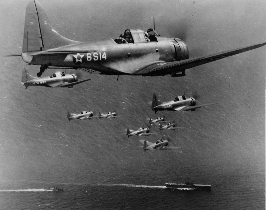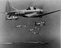 136k | Douglas SBD-2 Dauntless scout bombers, of Scouting Squadron Six (VS-6). Composite photograph of 9 planes in flight, with USS Enterprise (CV-6) and a plane guard destroyer below. The original photo is dated 27 October 1941. Note differences in ocean surface wave patterns between the upper and lower images, skillfully blended to combine the two photographs. Official U.S. Navy Photograph, now in the collections of the National Archives and Records Administration (NARA), # 80-G-6678. |