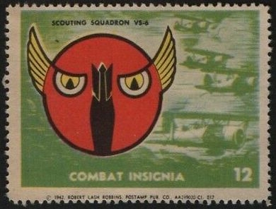 25k | Scouting Squadron (VS) 6 was established as VS-8B on 30 June 1937 and redesignated VS-6 one month later. The squadron always operated from USS Enterprise (CV-6), until disestablished circa September 1942. This stamp was published by the Hearst Publishing Company in 1942 and is based upon Disney combat insignia for VS-6. The design is adapted from a headdress worn by the high priests of the Aztec Indian race during the rites of human sacrifice. The basic design was changed somewhat to set forth the double purpose of the squadron, that is, the wide open, alert eyes, significant of scouting, and the bomb in flight, indicative of bombing. Partial text from U.S. Navy Aircraft 1921–1941, by William T. Larkins. |