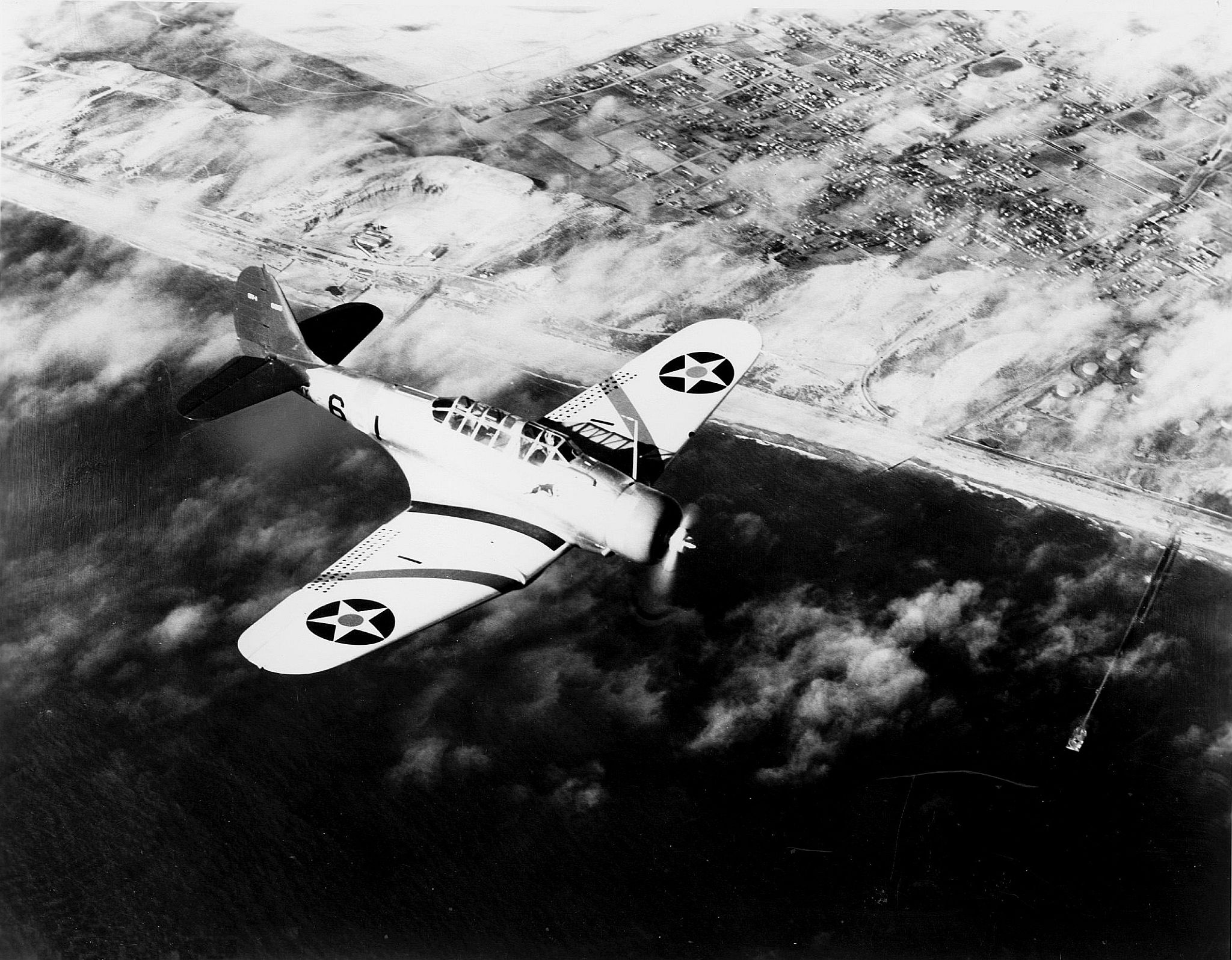 544k | A U.S. Navy Northrop BT-1 of Bombing Squadron (VB) 6 in flight. VB-6 was assigned to the aircraft carrier USS Enterprise (CV-6). Circa 1940. National Naval Aviation Museum photo, # 1996.253.1973. |