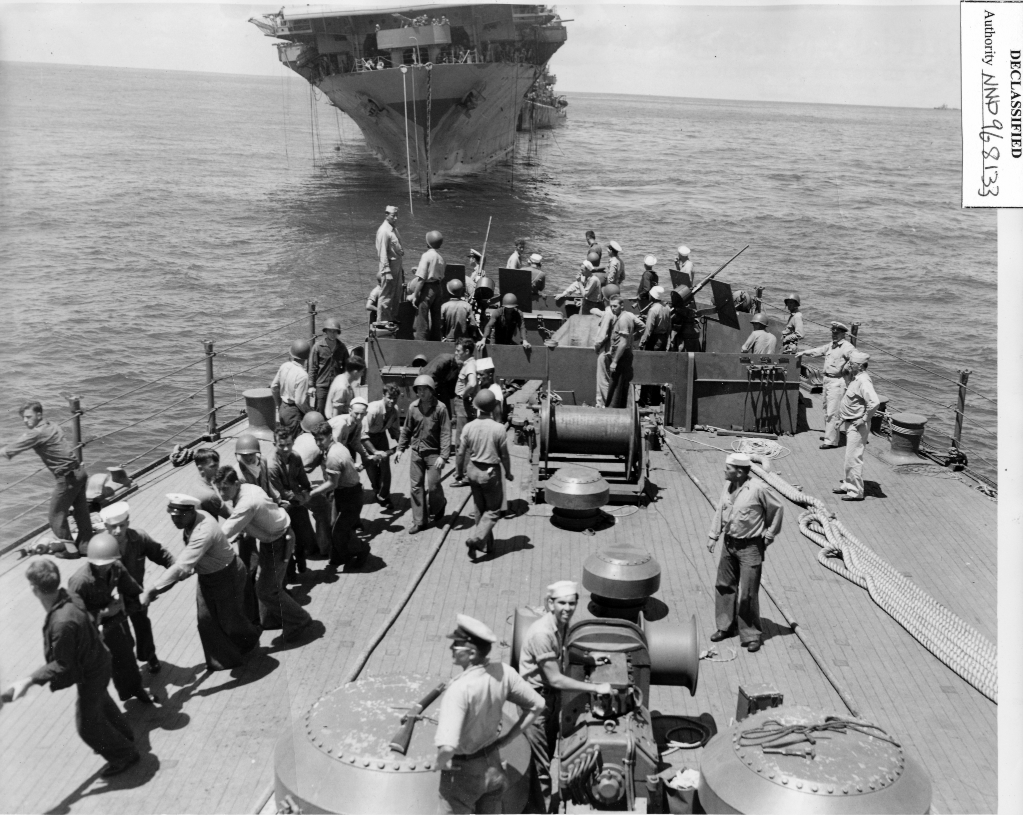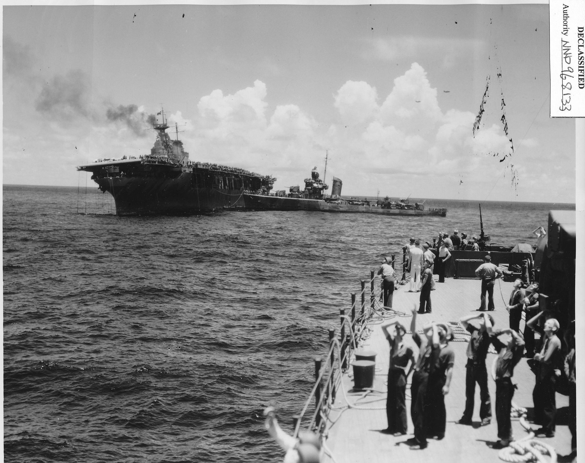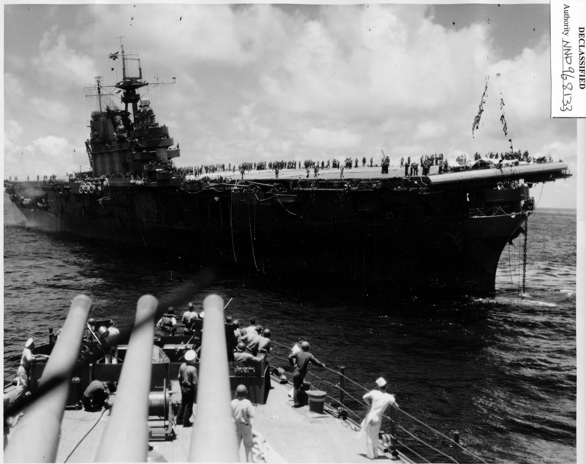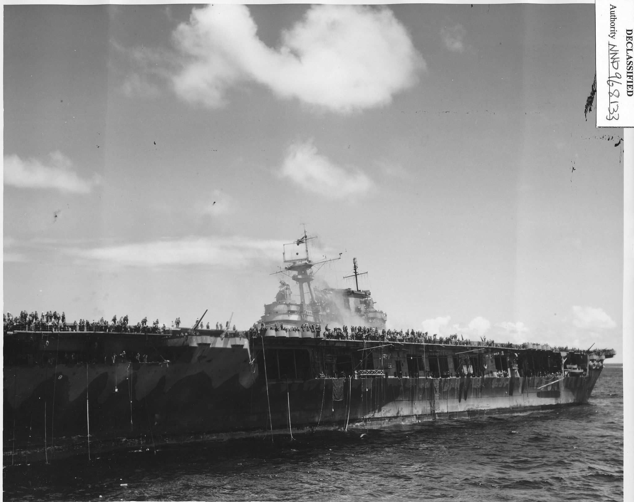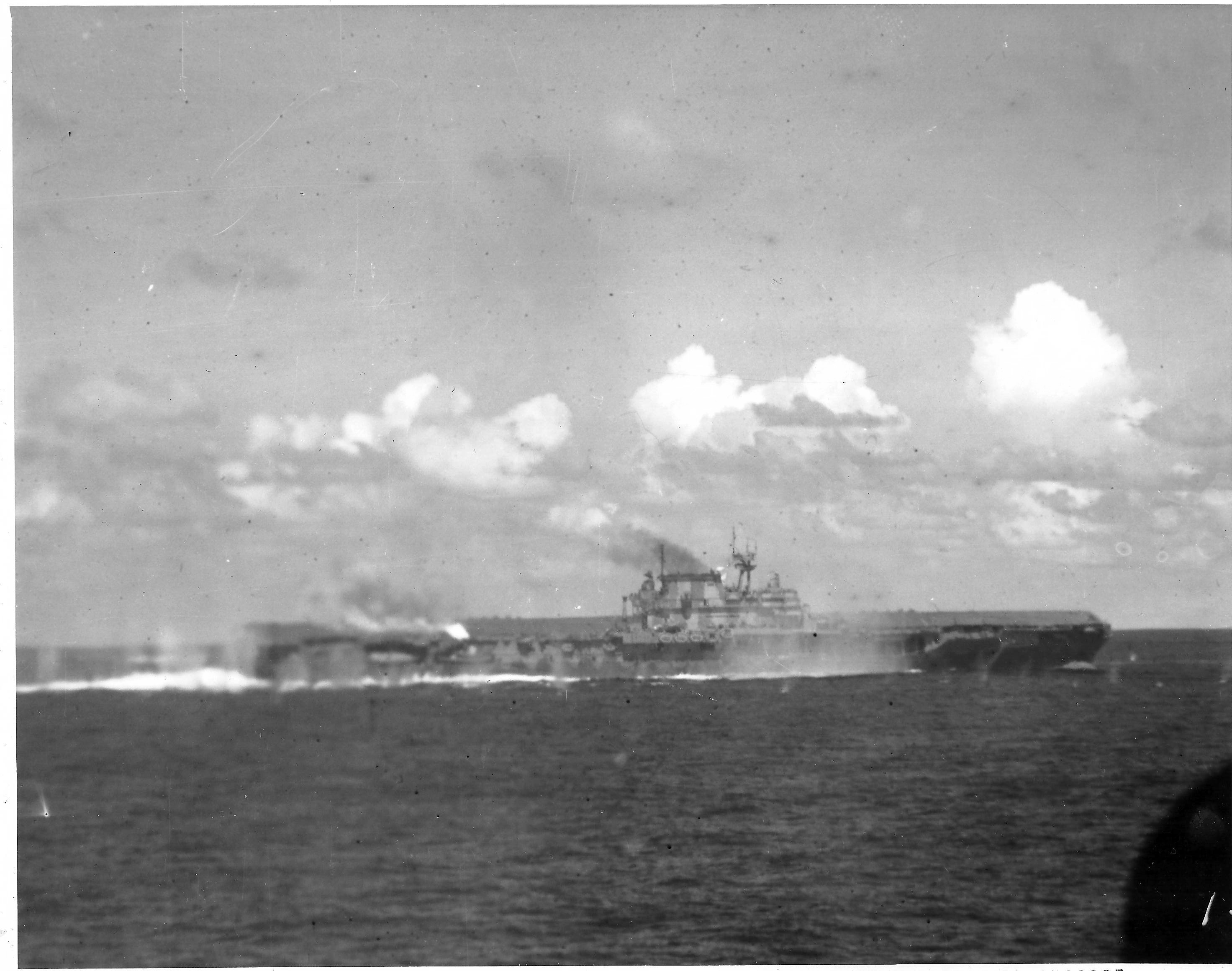 316k | October 26 1942, Hornet in tow. Cruiser Northampton (CA-26) made three attempts to take the carrier in tow, but additional Japanese attacks frustrated these efforts. The "X" above the bridge and the CXAM radar antenna indicates where T.R. Archer was wounded by a Japanese dive bomber in a suicide attack (see photos "020808" and "020809", above). |