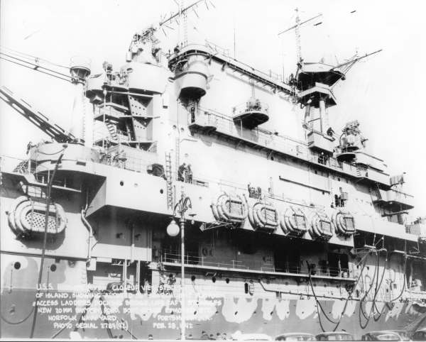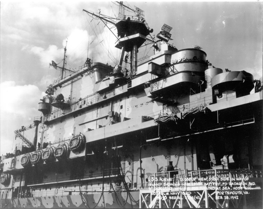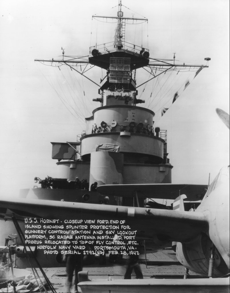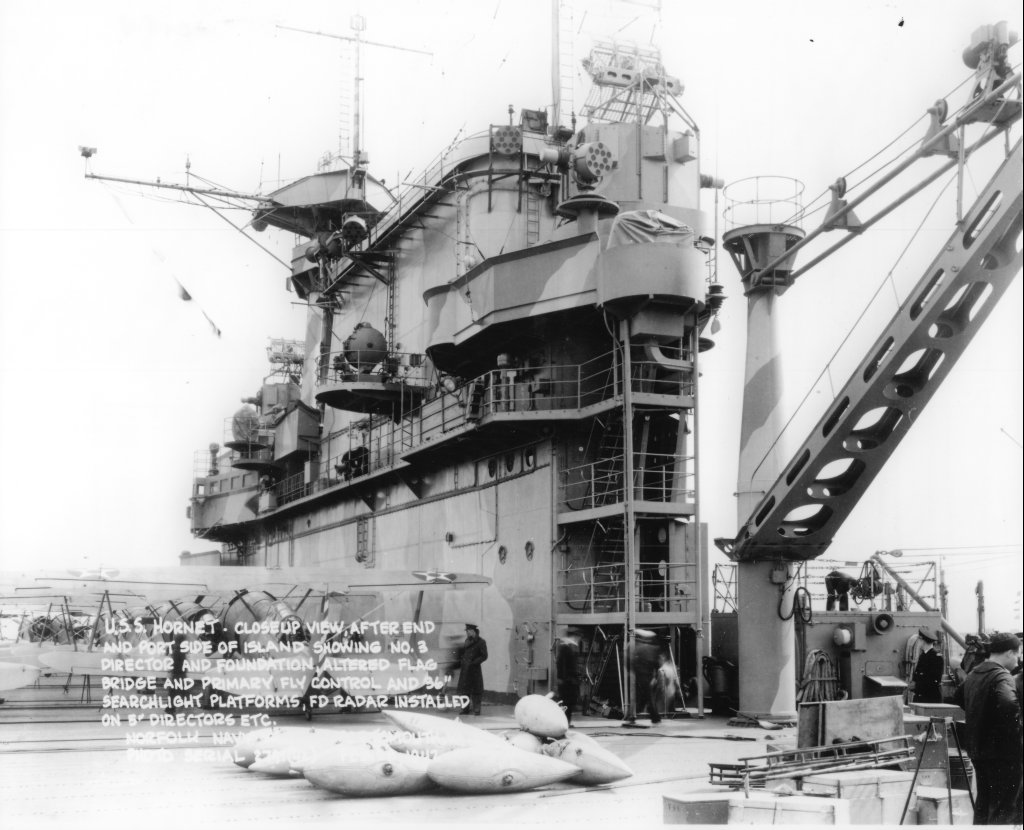 160k | USS Hornet (CV-8), closeup view, starboard side in way of island, showing new 20mm battery, Mk-4 (FD) radar on forward Mk-37 director, new rig for fueling at sea, hose, etc. Norfolk Navy Yard, Portsmouth, Va., Saturday, 28 February 1942. Photo serial #2788[?](42). |