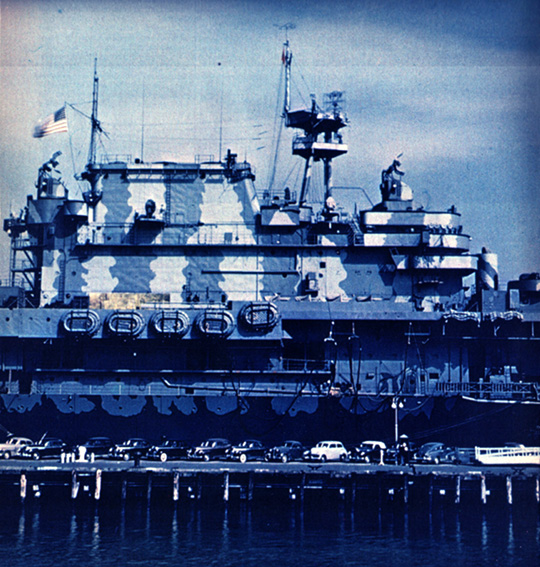 205k | Bow of the soon-to-be USS Hornet (CV-8), Hampton Roads, VA. The bow of the Moore-McCormack Lines Mormacland, being converted into an aircraft carrier, can be seen in the left background. From LIFE magazine, 1 September 1941. |