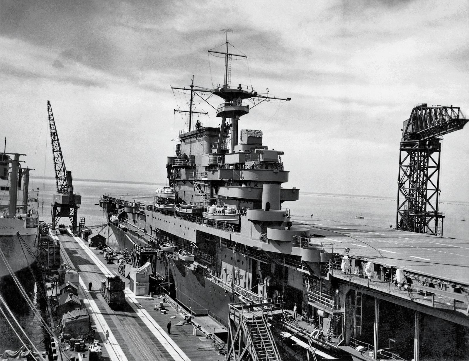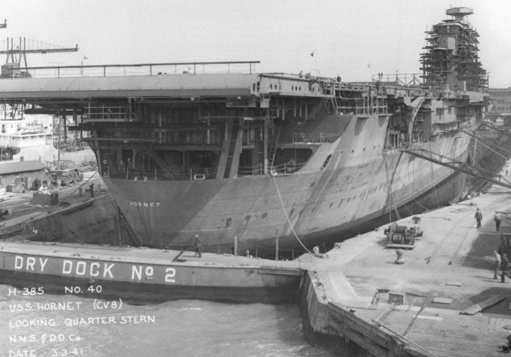 176k | Hornet (CV-8) is shown in Dry Dock at Newport News in 1941. |