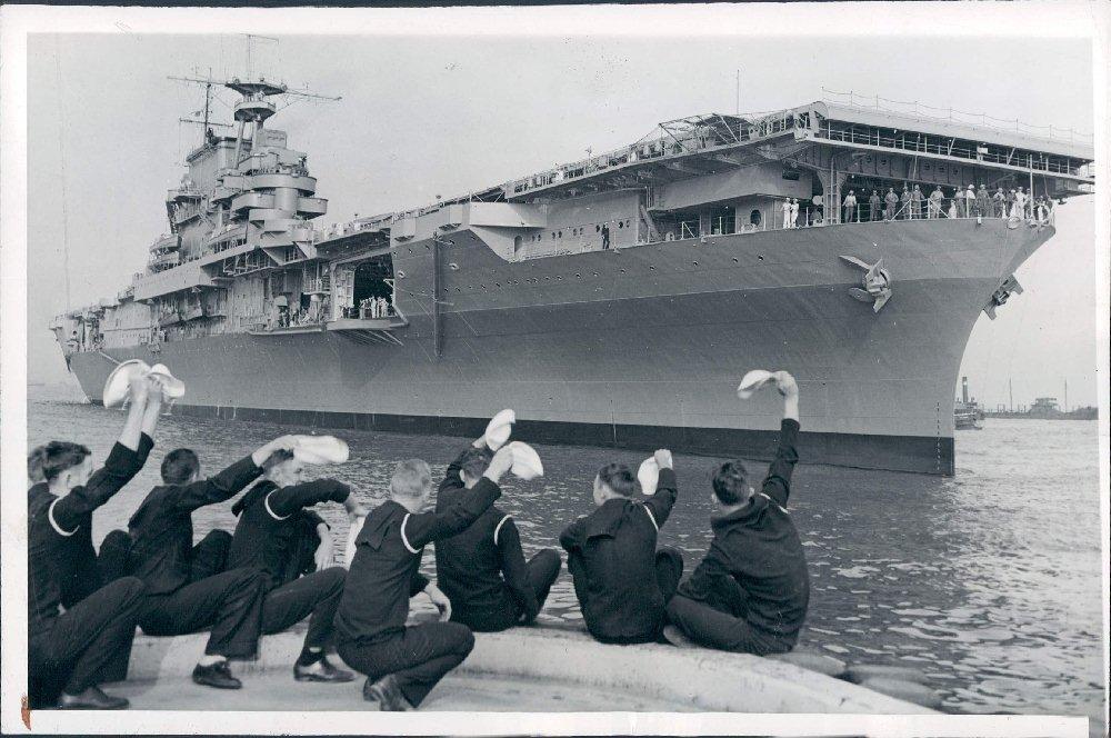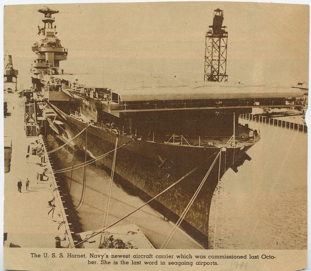 118k | "Newest Carrier Commissioned" "Norfolk, Va.—The Navy's seventh and newest aircraft carrier, the Hornet, as she put into Norfolk Navy Yard for commissioning ceremonies after short trip from Newport News, Va., yards where she was built." Acme Photo, 20 October 1941. |