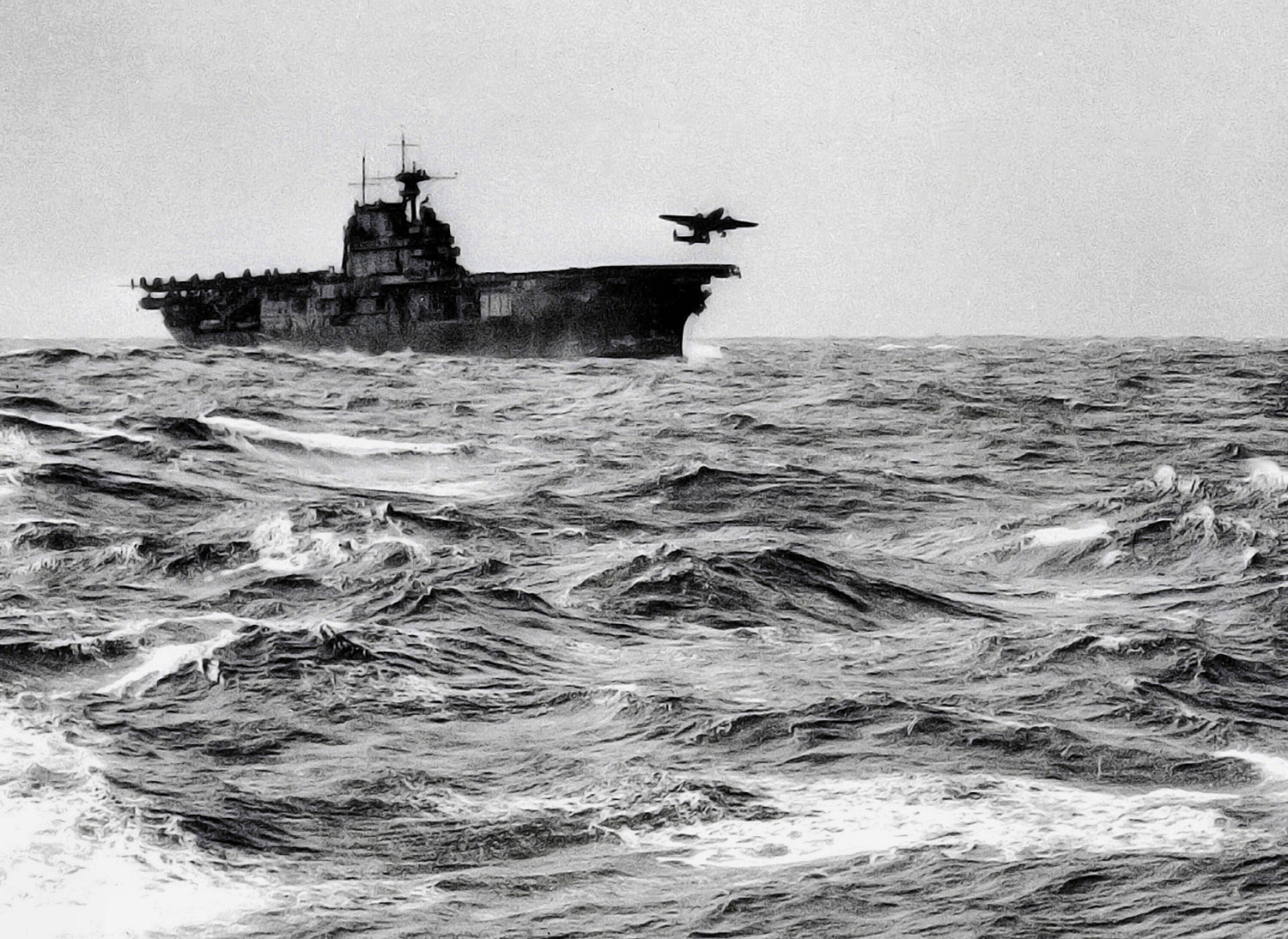 752k | Battle of Santa Cruz Islands, 26 October 1942. USS Hornet (CV-8) after the damage done by Japanese planes. Artwork by John Hamilton from his publication, War at Sea, pg. 159.