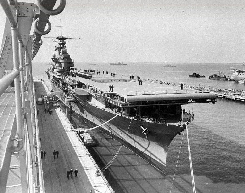 317k | Starboard bow view of USS Hornet (CV-8), 20 October 1941, at Norfolk Navy Base, the day of her commissioning. Life Magazine Archives, Thomas McAvoy photographer, shared by Peter DeForest. |