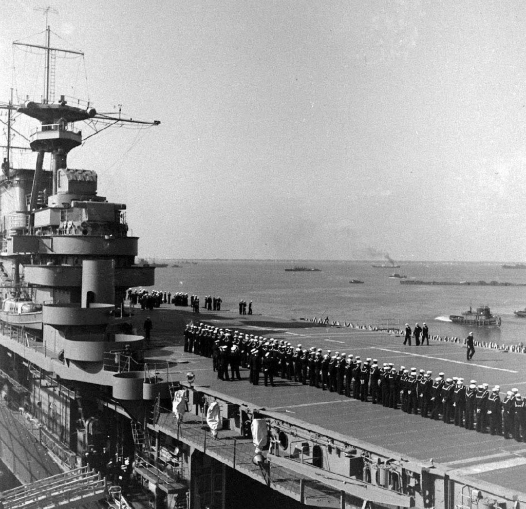 327k | October 26 1942, Hornet being abandoned. About 900 crewmen had been transferred to accompanying destroyers when, at 1523, Hornet took another torpedo on her starboard side. At 1550 the order to abandon ship was passed. |