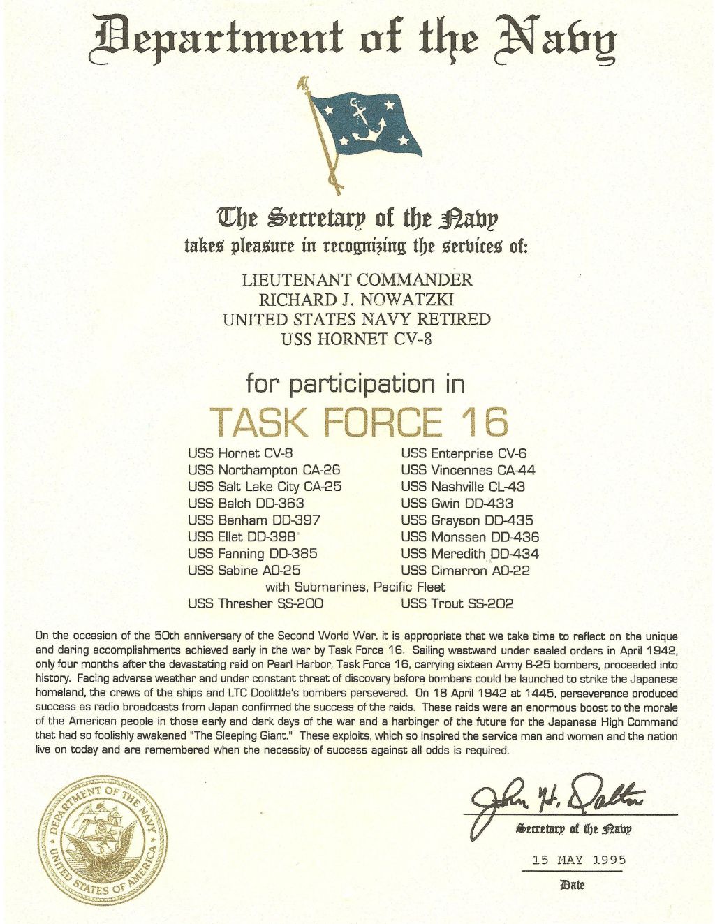 the Task Force 16 Citation by the Secretary of the Navy, Mr. John H. Dalton.