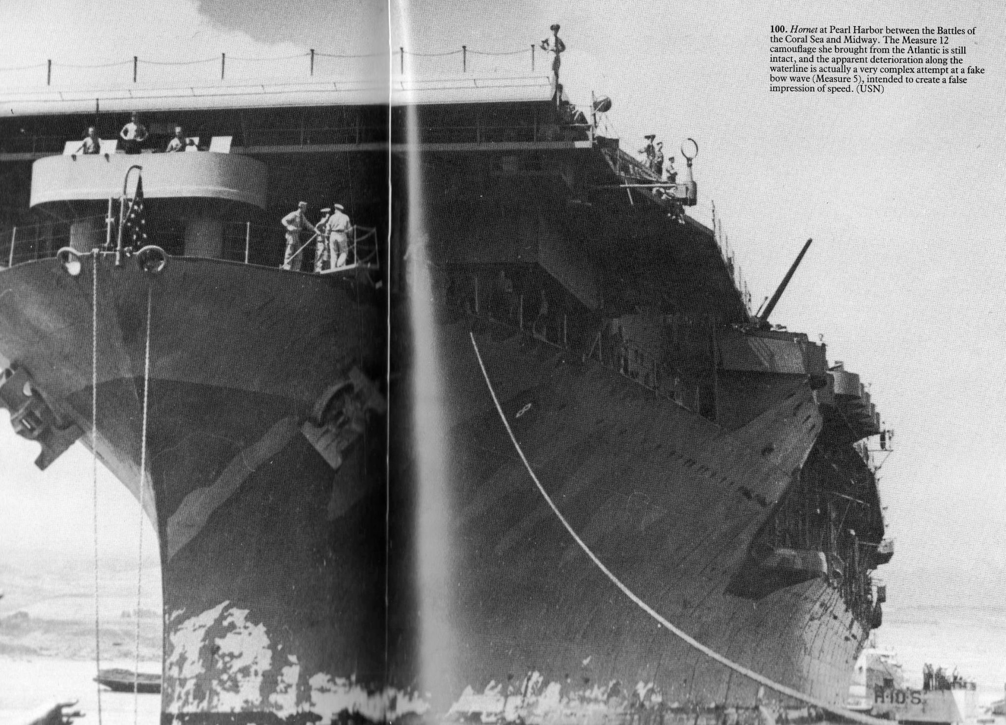 140k | USS Hornet just after commissioning, 20 October 1941. She was painted in Measure 12 camouflage. Armament and radar had yet to be fitted. Mk.37 directors on the island differentiated her from her older sisters Yorktown and Enterprise, fitted with Mk.33 directors. (Thanks to Robert Hurst, who provided additional info). Note that Hornet's hull number was actually CV-8. |