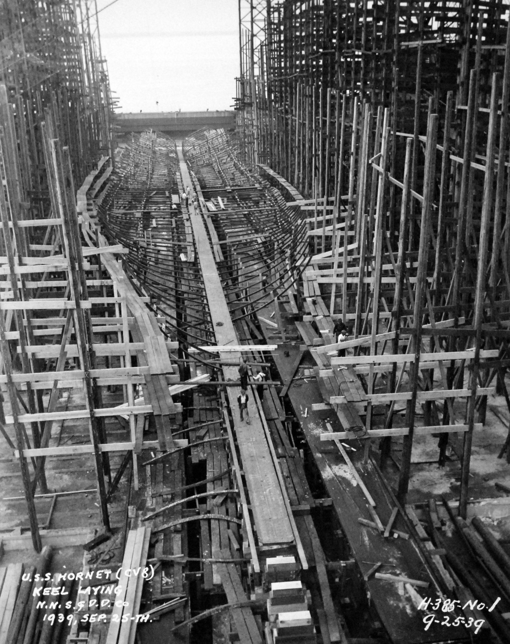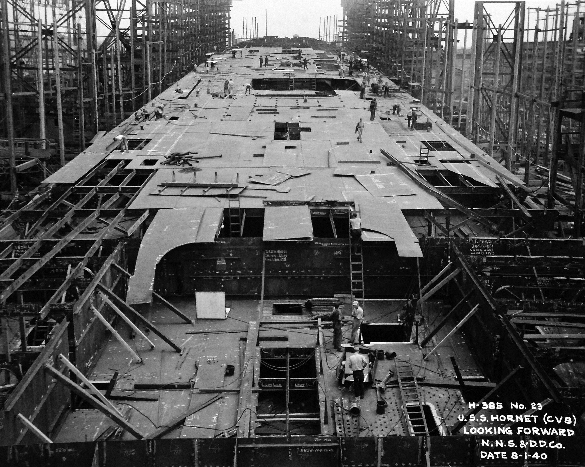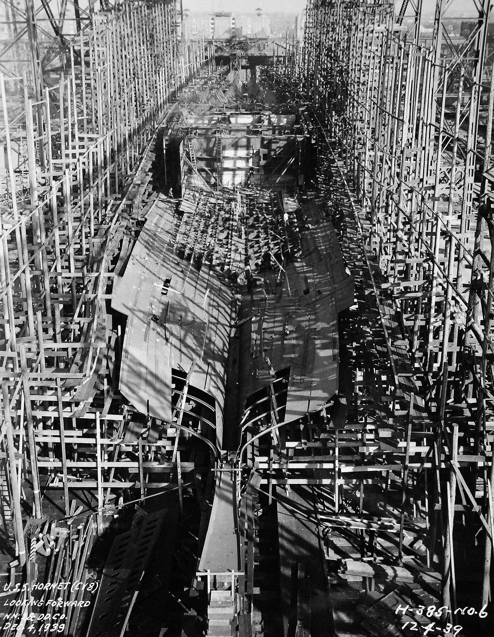 1.08M | The future USS Hornet (CV-8), looking forward, while being constructed at Newport News Shipbuilding, Newport News, Virginia, 4 December 1939. National Archives and Records Administration (NARA) photo, # 19-LC-26338. |
