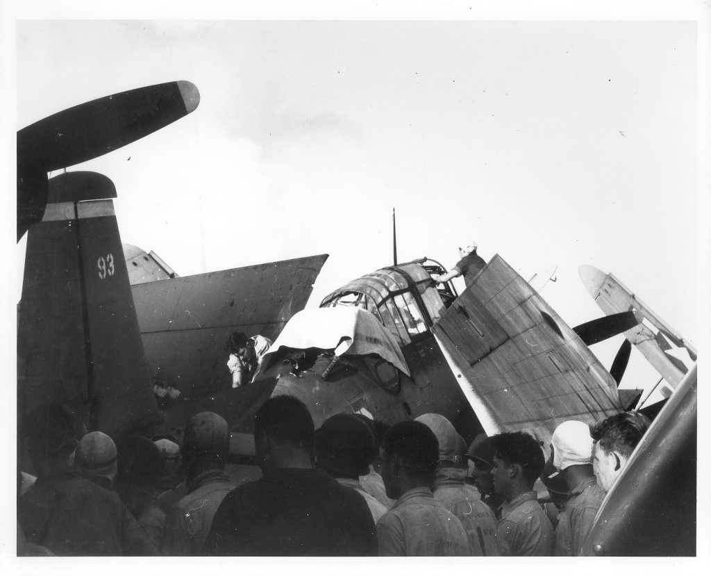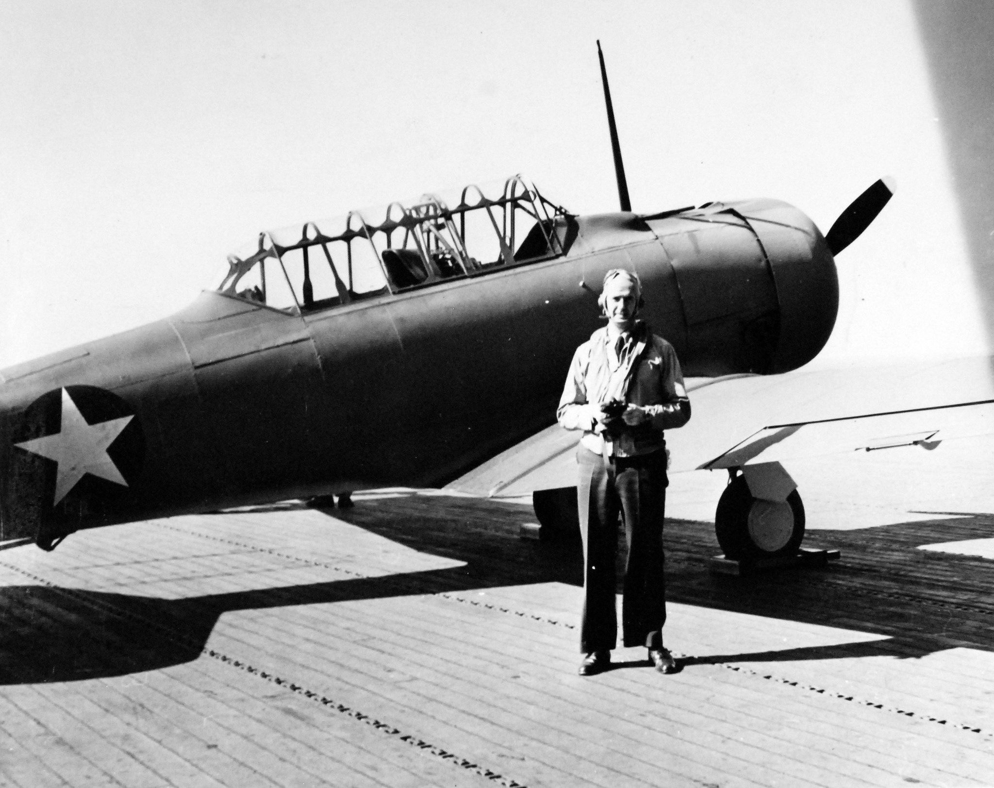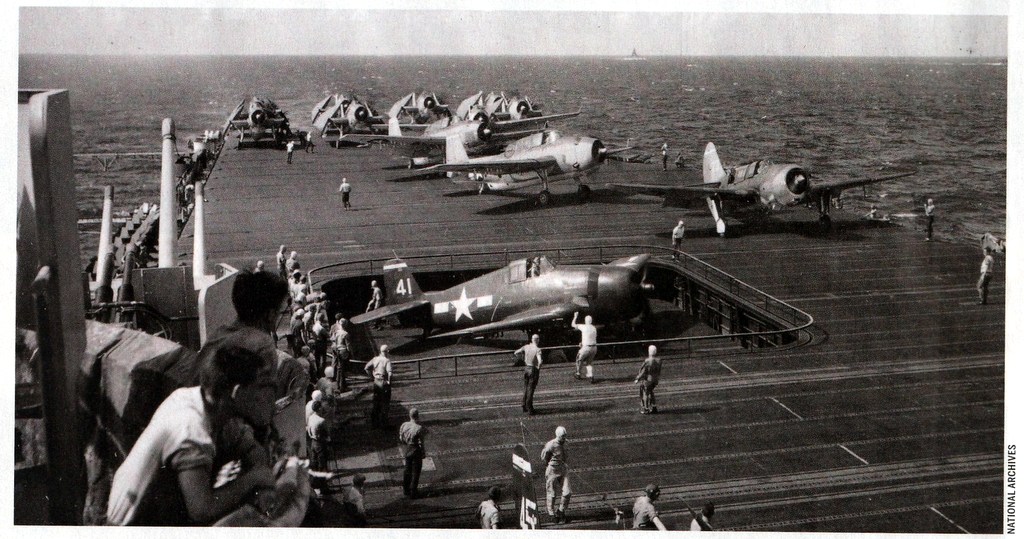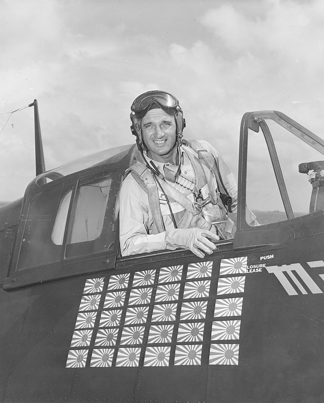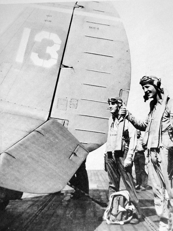 390k | Commander Fitzhugh Lee prior to first take off from USS Essex (CV-9), 16 February 1943. Official U.S. Navy Photograph, now in the collections of the National Archives and Records Administration (NARA), # 80-G-228006. |
