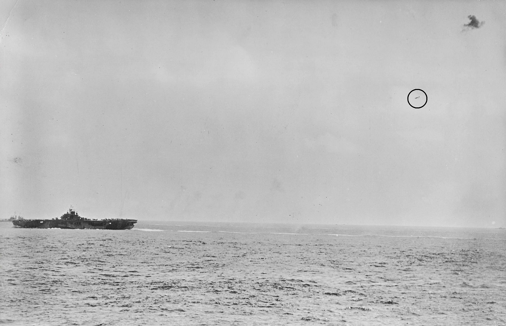 333k | Anti-aircraft bursts from Task Force 58 as a Japanese plane is hit and explodes just beyond USS Essex (CV-9), in an action off Okinawa, Ryukyu Islands, 11 April 1945. Photo taken from USS South Dakota (BB-57). USN photo. |