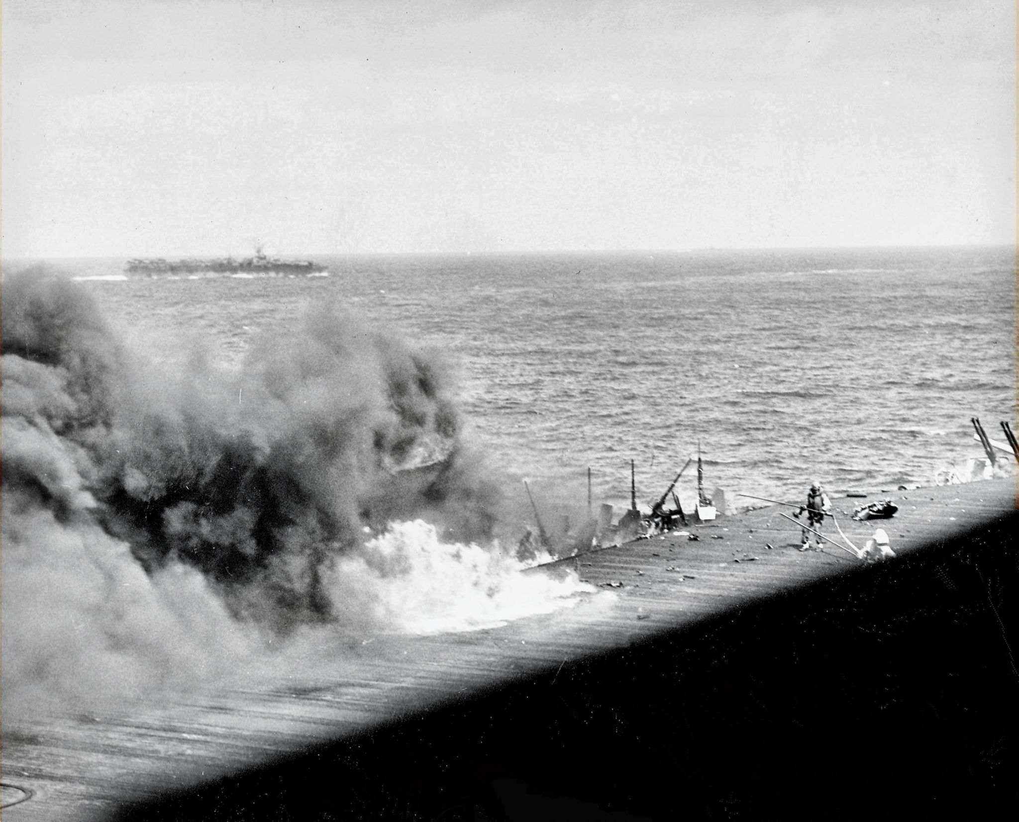 96k | Fire-fighters and scattered fragments of the Japanese kamikaze cover the flight deck of USS Essex (CV-9), 25 November 1944. |