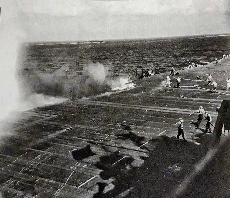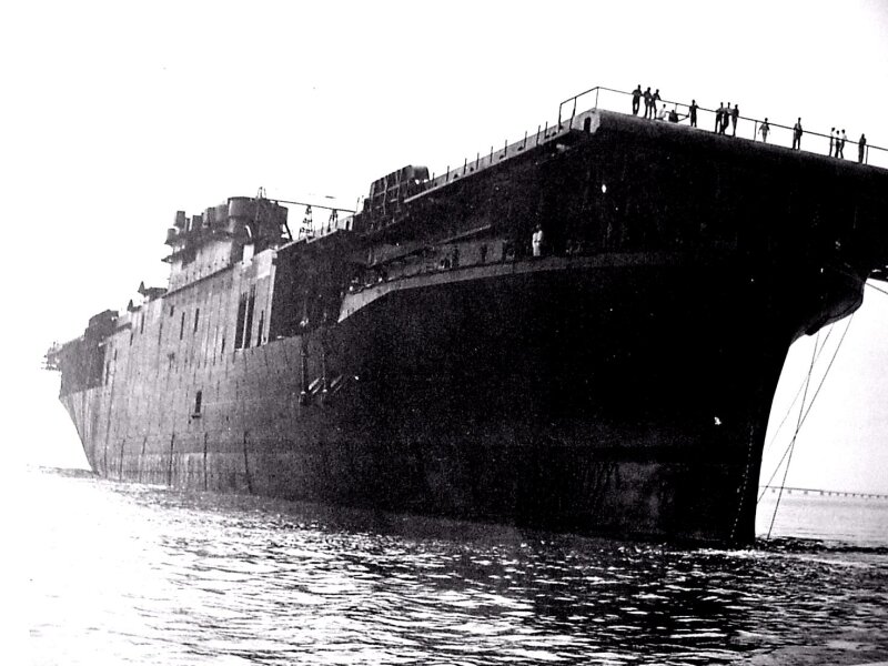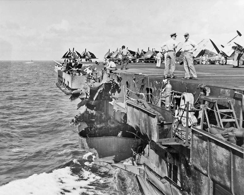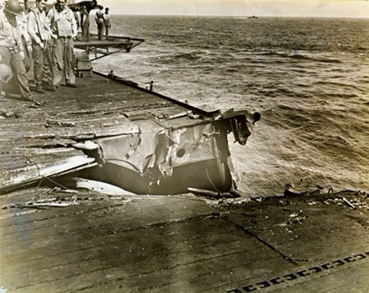 663k | USS Essex (CV-9), 25 November 1944. Repair parties covering over the hole. Flight operations were resumed a few minutes later. |