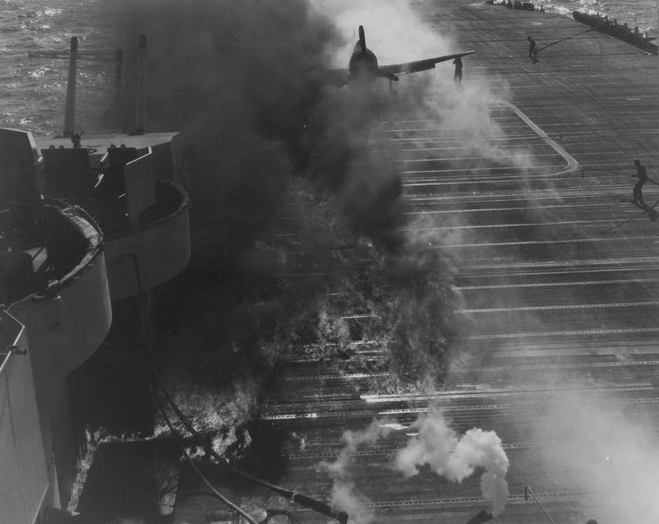 64k | Fire aboard USS Essex (CV-9) after an F6F-5P's Hellcat drop tank burst on landing, 16 December 1944. National Archives (College Park, MD) photo # 80-G-301346. |