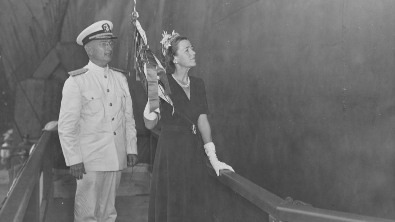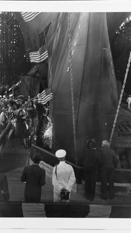 59k | Essex christening, Friday, 31 July 1942. Mrs. Artemus Gates, wife of the Assistant Secretary of the Navy for Air, Sponsor. |