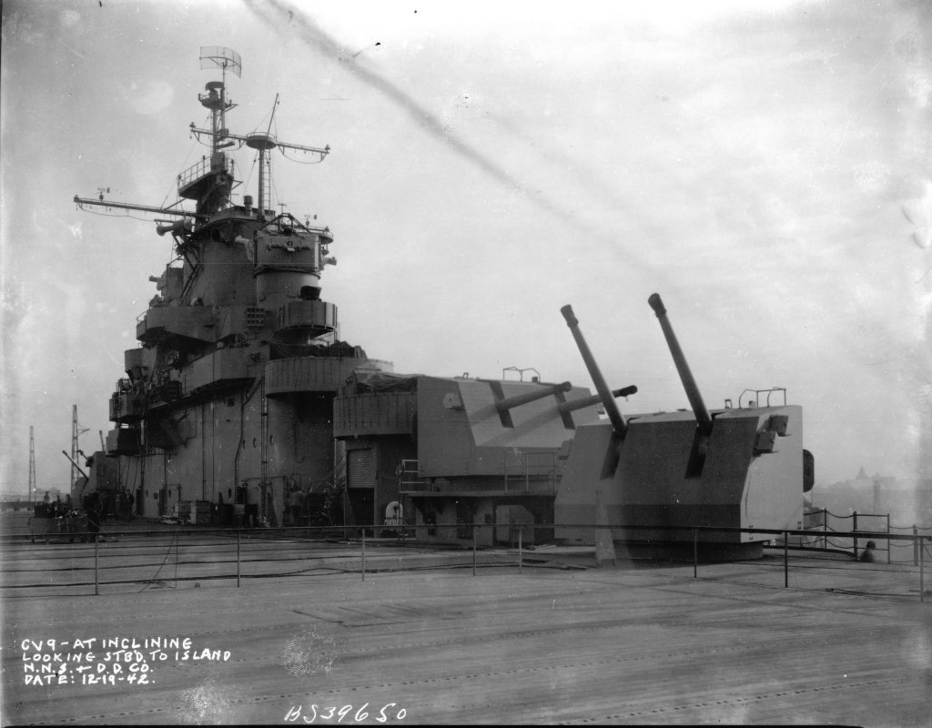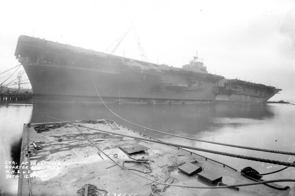 100k | Essex at inclining, 19 December 1942, looking forward. Newport News Shipbuilding & Dry Dock Company photo. |