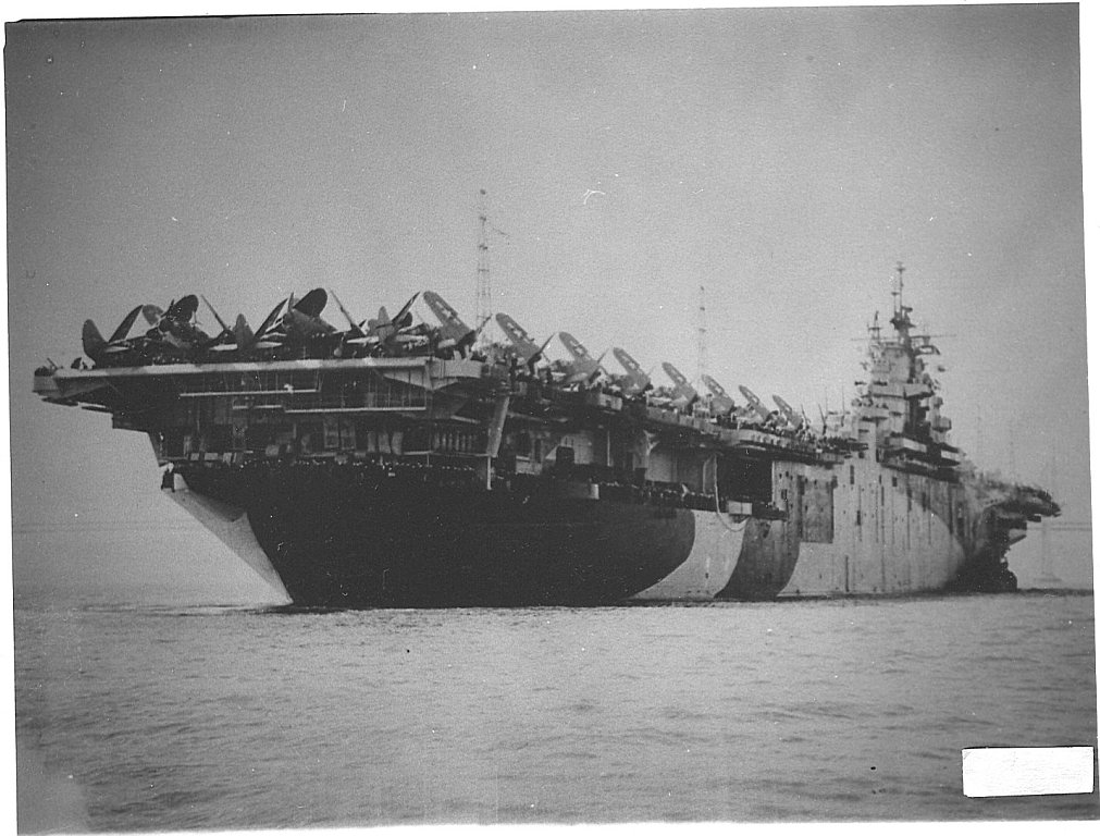 490k | Underway at sea during the Okinawa Campaign, 20 May 1945. Note that her air group contains both F4U Corsair and F6F Hellcat fighters. Official U.S. Navy Photograph, now in the collections of the National Archives and Records Administration (NARA), # 80‑G-373816. |