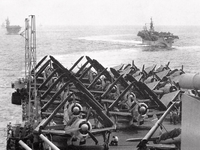 84k | F4U Corsairs and F6F Hellcats of Air Group 83 aboard USS Essex (CV-9), during the Okinawa Campaign. |