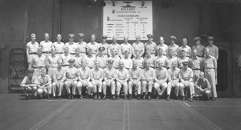 91k | Men of USS Essex posed in front of the ship's scoreboard, mid-1945. |