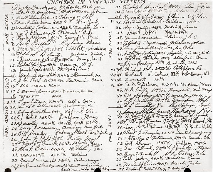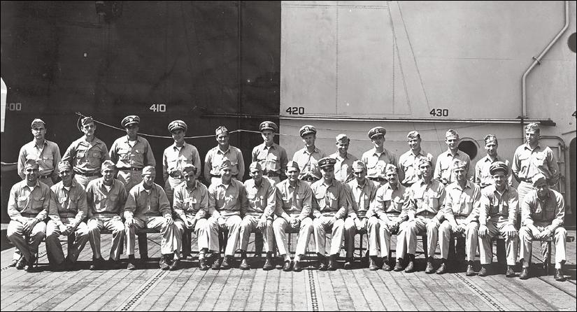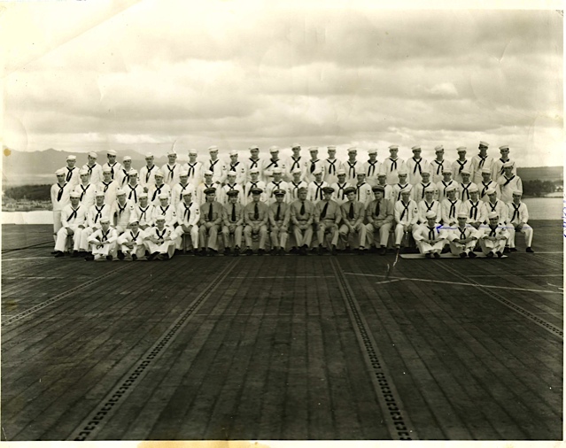 132k | Men of Engineering Department (?), B Division (?), USS Essex (CV-9). Owen Charles Candler is third from right, front row. |