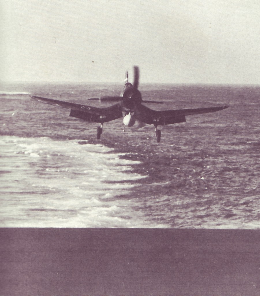 167k | A Marine Corps F4U-1D Corsair comes in for a landing aboard the carrier USS Essex (CV-9). Photo USN. From Aircraft Carriers, by Norman Polmar. |