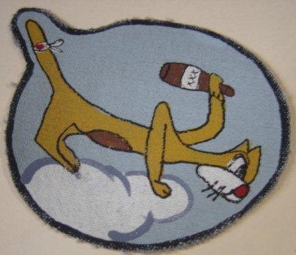 47k | VF-9 "Cat o'Nines/Hellcats" patch. Painted on canvas and made by Max Berman Costume and Props of Los Angeles for RKO movie studios. One of the longest-serving fighter squadrons of the war (aboard Ranger, Essex, Lexington and Yorktown), VF-9 was also one of the few to engage two enemy powers—Vichy French (Morocco, November 1942, from Ranger) and Japanese aircraft (March 1943–June 1945; Essex, Lexington and Yorktown). With 256.75 victories, VF-9 finished the war as the third-ranking FitRon in the Navy; top scorer was LT Eugene A. Valencia, with 23. |
