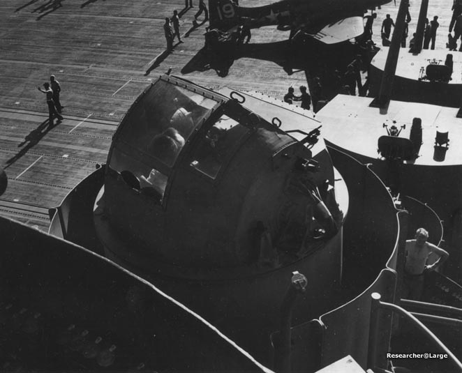 84k | USS Essex (CV-9). View of island. Date and location unknown. |