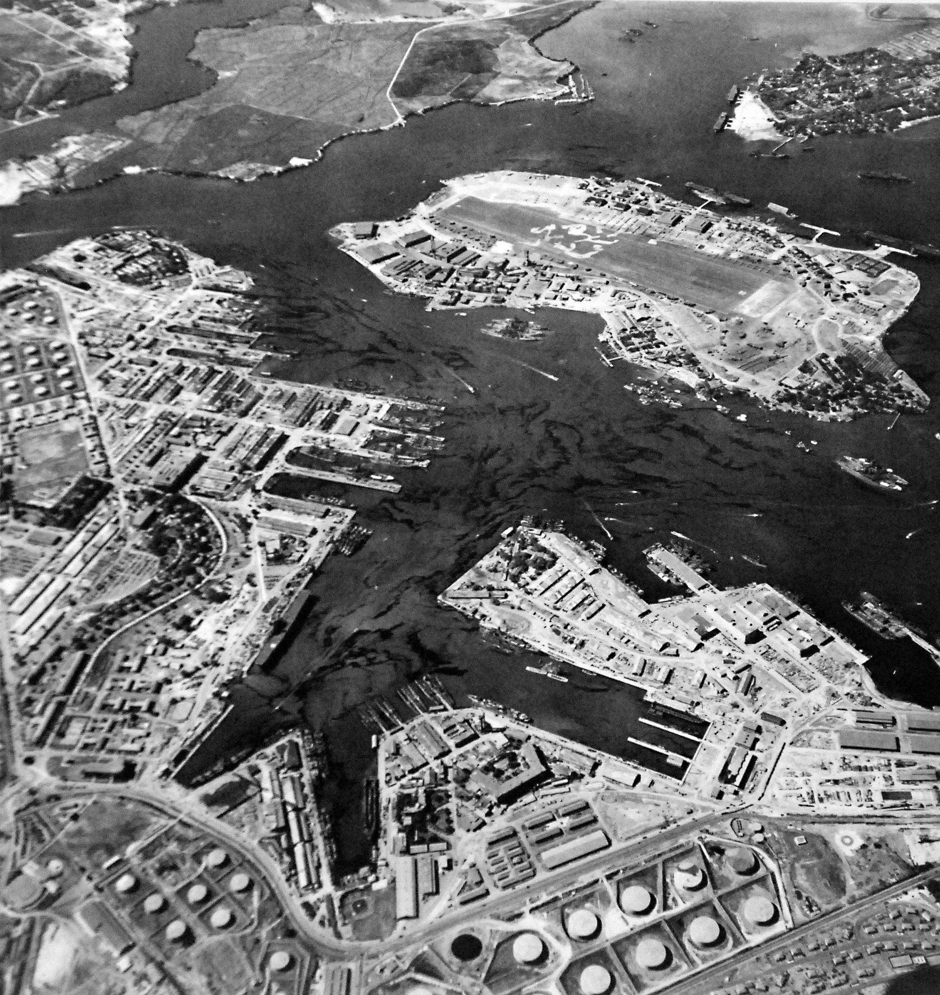 751k | U.S. Navy Yard, Pearl Harbor, Territory of Hawaii. Aerial view of Ford Island, 18 August 1943. Visible aircraft carriers are: