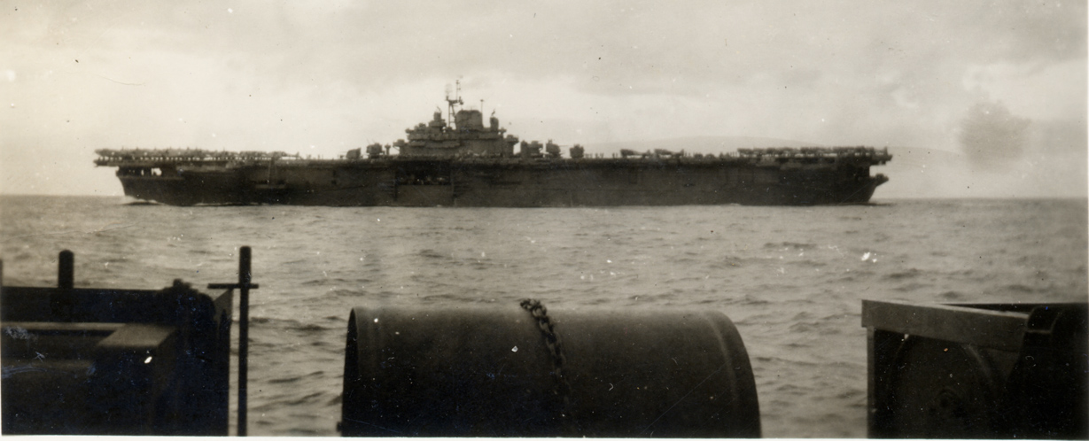 352k | USS Essex (CV-9) underway from Pearl to operations in Southwest Pacific area, as part of Task Group (TG) 53.3. USS Guadalupe (AO-32) is refueling Essex on 1 November 1943. Photos by Bob Lehman, USS John Rodgers (DD-574). |