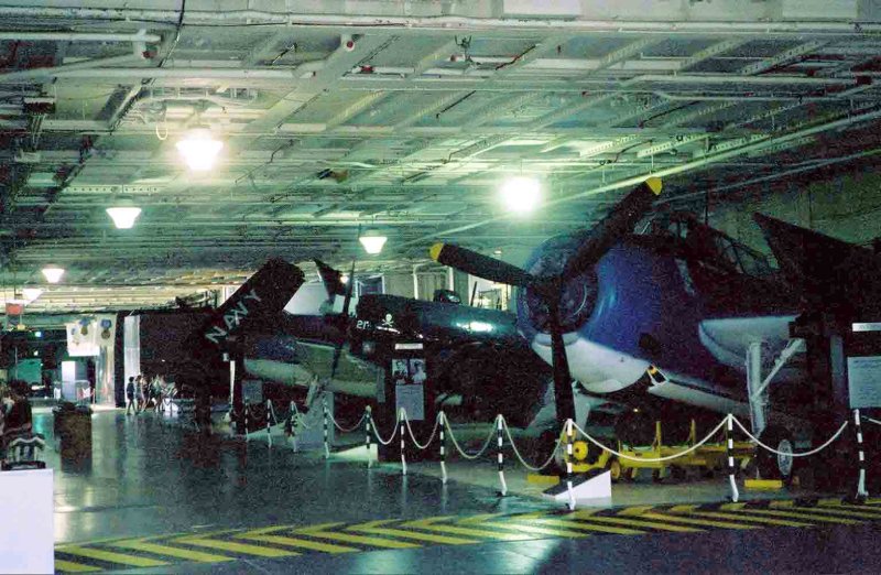 More War Birds on display in the hangar deck. Closest to camera is General Motors TBM-3