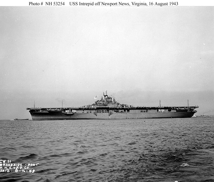 84k | USS Intrepid (CV-11) off Newport News, Virginia, on 16 August 1943, the day she went into commission. U.S. Naval Historical Center Photograph (# NH 53254). |