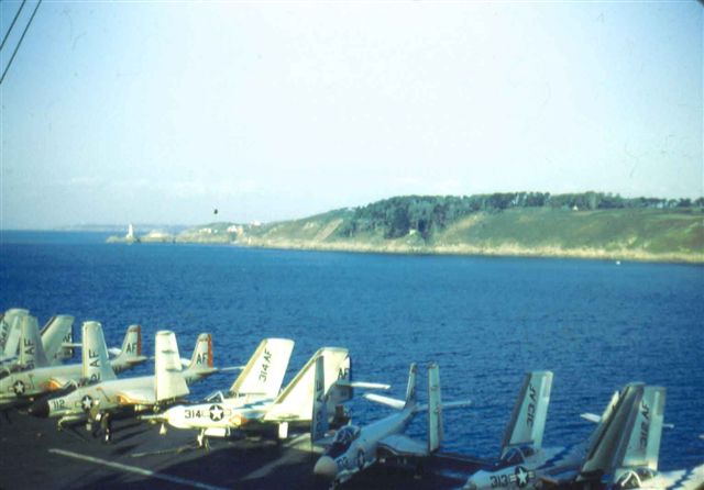 39k | Arriving Brest, France, October 1957. Parked on deck are F2H-3 Banshees of VF-71 and F9F-8B Cougars of VA-66 "Waldomen." |
