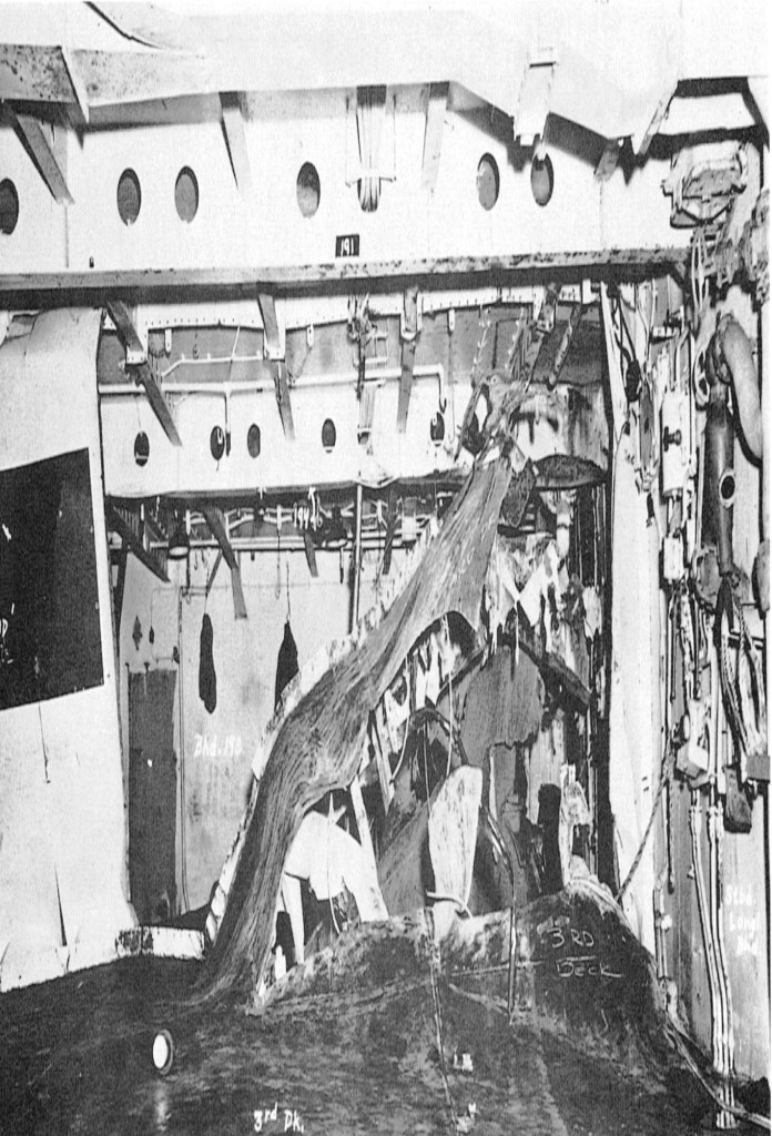 219k | Damage to the starboard side of the 3rd deck aft caused by the torpedo hit of 17 February 1944. This view was taken looking aft from the CPOs mess (stations 184–192). USN photo. |