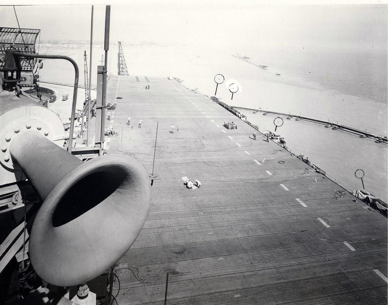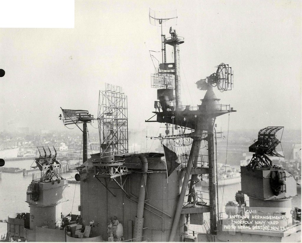 155k | USS Intrepid (CV-11), antenna arrangement, Norfolk Navy Yard, 23 November 1943. Photo serial 6557(43). |