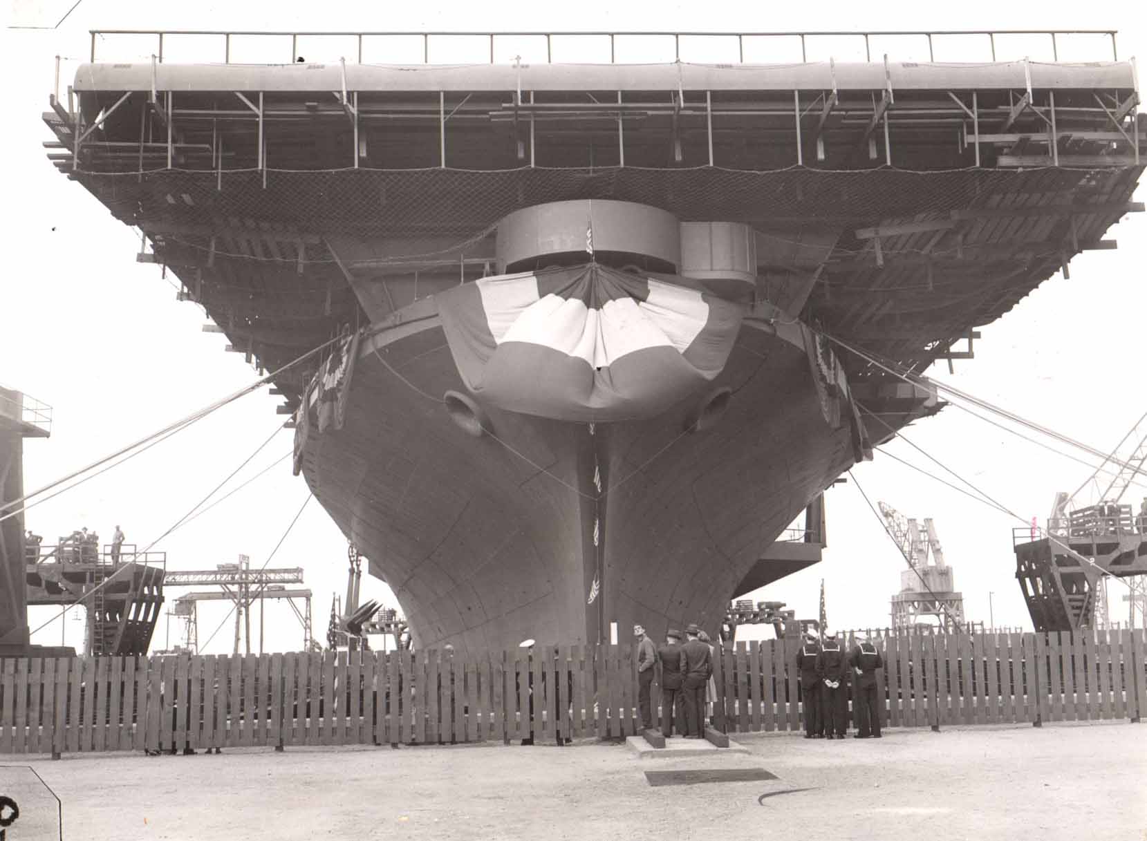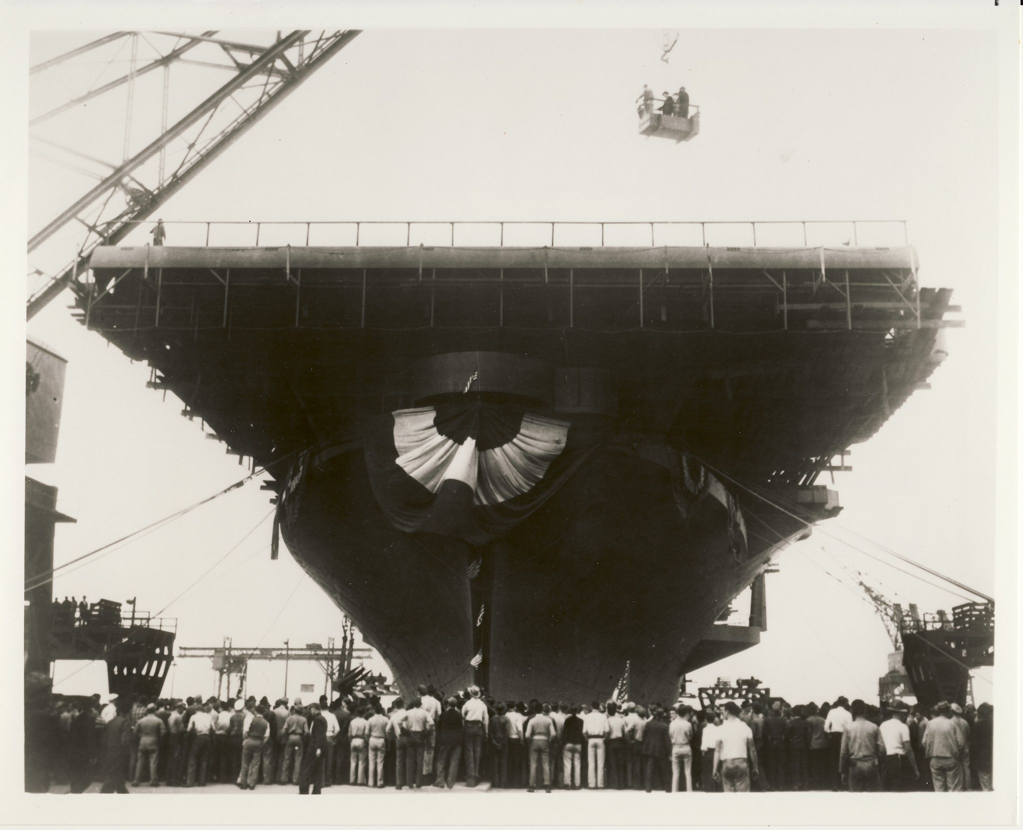 244k | "The Intrepid aircraft carrier is launched in restricted wartime ceremonies on April 26, 1943 at the Newport News Shipbuilding and Dry Dock Company in Newport News, Virginia. All photographs of the ship's christening were sent to Washington, D.C. for censorship prior to publication. Following its christening, the carrier was rushed to her fitting-out berth for completion before joining the fleet for her role in World War II." |
